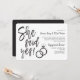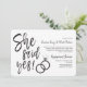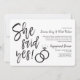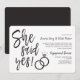 Um convite divertido e único com letras personalizadas, feito sob medida para o seu animado jantar ou festa de noivado. Ele apresenta as palavras "Ela Disse Sim!" com anéis de casamento ao lado. Na lateral, há espaço para os detalhes da sua festa ou evento especial.