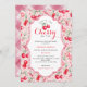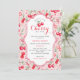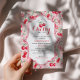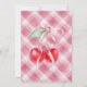 Um doce convite de chá de fraldas, estilo coquete, com um fundo cor-de-rosa pincelado com cerejas de aquarela, flores, fitas e pérolas. O design frontal exibe uma elegante estrutura com detalhes personalizáveis do chá, enquanto o dorso exibe cerejas encantadoras amarradas com um arco de cetim rosa sobre um padrão de gingham esfarelado. Perfeito para um chá de fraldas temático "Cherry on Top" que é feminino, divertido e único.