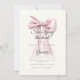 chá de panela temático "Ela é casando" com design de arco rosa e texto de script em fundo de marfim.