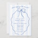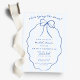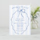 Chá de panela na moda azul e Arco branco da porta desenhada pela mão com um quadro de fita oval ondulada puxado pela mão, cortado com um arco. O título editável "ela é casando" está em uma fonte azul, escrita à mão, em um fundo listrado azul e branco.