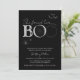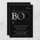 Tema do Chá de panela de Halloween "Ela achou seu Boo" apresentando convite assustador mas elegante com anel de diamante, aranhas, teia de aranha e morcegos voadores em fundo negro com tipografia elegante e sofisticada. Esses produtos podem ser facilmente editados com seus detalhes pessoais.