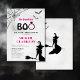 Ela encontrou seu Chá de panela de Boo Halloween com bruxa voando sobre vassoura, teia e morcegos. Convites de chá de panela do tema do Dia das Bruxas.