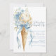 Este convite de chá de panela encantador apresenta um cone de sorvete charmoso com detalhes florais e um laço fofo em tons de azul empoeirado. Uma maneira doce de celebrar a noiva!