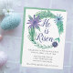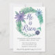 Um belo convite de festas religioso decorado com uma adorável coroa e coroa verde coroa floral. O interior lê Ele é Risen e o texto abaixo contém detalhes para seu janto ou reunião de almoço para celebrar Jesus Cristo com a família e amigos no domingo de Páscoa.