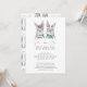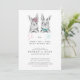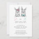 Um belo gênero preto e branco revela um convite com dois adoráveis coelhos desenhados à mão, uma menina e um menino, no topo da carta, com "Ela ou Ele, o que será o nosso coelhinho bebê?" escrito abaixo em rosa, azul e cinza escrita com letras escritas à mão e sans serif typografia. Personalizado com os detalhes da parte abaixo, a parte traseira da placa apresenta os adoráveis coelhos com "ela ou ele" acima, alinhados na parte traseira da placa. Copyright Elegant Invites, todos os direitos reservados.