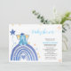 a design da frente mostra um pequeno elefante de bebê azul no topo de um único e azul arco-íris elegante no lado esquerdo e um convite para chás de fraldas em azul-céu e preto no lado direito. este doce design bonito será perfeito para o seu chá de fraldas.