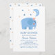 Bonito chá de fraldas Convite com elefante e lua engraçados, estrelas em azul pastel.
