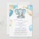 Este adorável convite virtual para chás de fraldas apresenta turquesa e elefante para bebês cinzas com balões de ouro e turquesa e confete. Facilmente personalizado para o seu evento clicando em 'Personalizar'. Perfeito para aqueles chás de fraldas neutros em termos de gênero!