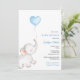 Chá de fraldas com um elefante de aquarela adorável segurando um balão de coração azul. Personalize com suas informações ou clique em "Clique para personalizar mais" para editar estilos de fonte, tamanho e cores.