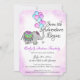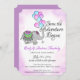 Logo a aventura começa o convite para chás de fraldas com adorável elefante decorado com um cheio de balões para anunciar o bebê a caminho. Design neutro em gêneros, roxo, rosa e azul, para um chá de fraldas colorido e divertido.
