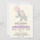 Elefante de bebê bonito com balões pastel rosa, roxo e amarelo; convite para chás de fraldas de meninas. Personalize este convite bonito e retrógrado; pode ser para chá de fraldas de menina ou pode ser mudado para borrifo de bebê. Bela, simples, design simples. Possui elefante, fita e corações roxos lavandas, fonte marrom e fundo branco fora. Excelente para animais da selva, animais do zoológico ou chá de fraldas temático safari ou borrão!