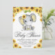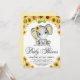 Chá de fraldas de girassol feminino com adorável elefante bebê com máscara em um girassol bonito e fundo de ponto amarelo. Este convite para chá de fraldas girassol giro é facilmente personalizado para o seu evento simplesmente adicionando os detalhes do seu evento.