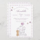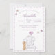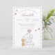 Este convite de chá de fraldas personalizado apresenta uma ilustração do estilo de aquarela fofinha. Um pequeno elefante bebê é fotografado no fundo segurando um balão cor-de-rosa em forma de coração. Uma pilha de blocos de alfabeto é colocada na frente dela.