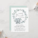 O convite para o bebê neutro em termos de gênero, que apresenta "A Sweet Little Peanut Is On Your Way" na tipografia moderna e um guião de na moda com um inchaço cardíaco, e uma ilustração com aquarela de um elefante bebê verde em forma de menta giro, numa coroa de verde-sábio eucalipto verde-verde.