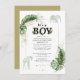 A girafa temida da floresta selvagem, e os rapazes elegantes, o convite para chá de fraldas de safari, com uma girafa, um elefante, folha de ouro e folhas verdes. Perfeito para os convites de um bebê