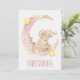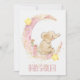 Elefante bonito sentado em uma lua crescente com estrelas douradas, flores e brilho para um convite para chá de menina.