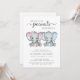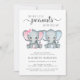 Uma gira e um bebê gêmeos bonitinho, chamando "Dois Pequenos Amendoins Doce Estão A Caminho" escrito em tipografia moderna de cinza macia e um roteiro de na moda e uma coloração aquosa rosa e azul pastel de elefantes bebês. Personalize o nome da futura mãe e os detalhes de aspersão em uma simples tipografia de cinzas.