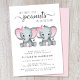 Um belo convite para bebês gêmeos com "Dois Pequenos Amendoins Doce Estão A Caminho" escrito em tipografia moderna de cinza macia e um roteiro de troca de na moda e duas aquarelas cor-de-rosa de elefantes bebês. Personalize o nome da futura mãe e os detalhes do chá em uma simples tipografia de cinza.