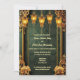 Um belo fundo floral de brocadas em um verde profundo de floresta é enquadrado por um quadro de ouro ornamentado que tem dois elefantes indianos ouros nos cantos inferiores. Cinco lanternas brilhantes pendem da borda superior e delicadas linhas verticais de borda aparecem nas laterais. Este design inspirado Hindi tem modelos brancos para seu texto personalizado e o verso tem um modelo para mais detalhes para convidados e familiares que podem ser removidos se não for necessário. Os tons quentes dão a esta design uma sensação luxuosa, elegante e supermercado. Este convite é ideal para celebrar qualquer cerimônia hindu ou qualquer celebração ou casamento de etnia asiática.