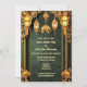 Um belo fundo floral brocade num verde-floresta escuro é coberto por bandas verticais ouros falsos e um arco florescente no topo. As elegantes lanternas índias brilhantes penduram ao longo da borda superior com um pequeno elefante ouro entre elas e duas flores de lótus aparecem ao longo da borda inferior. O fundo da brocade tem modelos brancos para sua redação personalizada. Os tons quentes dão a esta design uma sensação luxuosa, elegante e supermercado. O verso tem uma modelo adicional para mais detalhes para convidados e familiares. São ideais para celebrar Mehndi; Mehendi; Sangeet ou qualquer celebração ou casamento étnico-asiático.