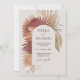 Uma bela mistura de palmas secas tropicais que enquadra seu texto em uma popular estrutura geométrica arquivada adiciona um apelo especial aos seus convites para o casamento. A paleta de cores morna e neutra é uma escolha versátil ao longo do ano e é especialmente adorável para o verão ou casamentos outono. Mostradas aqui com um fundo bege/névoa, outras cores estão disponíveis. Personalize o modelo de texto com os detalhes do casamento.