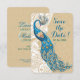 Cartão de Save the Date de casamento elegante com pavão e renda com um toque Art Nouveau. Belos tons de aqua e azul-turquesa com painel lateral enrolado branco. O fundo é um delicado tom sobre tom de renda floral sobre cor de areia. Verso do cartão correspondente. Personalize os nomes na área de trás e a data do casamento. Também disponível em estoque de Cartão de Visita em pacote de 100 unidades. Outros itens correspondentes na minha loja.