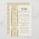 Convite de aniversário de bodas de cinquenta anos dourado e branco deslumbrante com fundo sutil de listra vertical branca na frente do convite e painel lateral de renda floral dourada elegante e detalhada. O verso do cartão tem padrão de renda dourada correspondente sobre o branco. Personalize a frente do convite com suas informações. O cartão também está disponível em versão retangular na minha loja.
