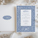 Este maravilhoso convite de casamento combina elegância islâmica com a intrincada beleza dos designs florais inspirados por William Morris. O convite é enfeitado com delicados padrões botânicos em azul marinho e branco macio, criando um eterno, uma sensação de safra. A frente apresenta uma majestosa fronteira floral que enquadra os detalhes do casamento, acentuado pela bela caligrafia árabe no topo. O dorso é decorado com um refinado motivo floral e as iniciais do casal, acrescentando um toque personalizado. Perfeito para casamentos islâmicos elegantes, este convite combina arte clássica com sofisticação moderna, ideal para aqueles que buscam incorporar tanto tradição quanto romance em seu dia especial.