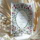 Invite your guests in stunning style with this exquisite wedding invitation, drawing inspiration from the elegant Art Nouveau and Arts & Crafts movements. The design showcases a beautifully symmetric floral border filled with stylized tulips in rich shades of magenta, deep pink, and mauve. Delicate stems in sage green are accented with purple and periwinkle-blue leaves, creating a lush, artistic frame. A patterned oval border in a deep green encircles your wedding details, which are presented in a classic and sophisticated, fully customizable font. This invitation is perfect for a formal, vintage, or garden-themed wedding, appealing to couples with a love for fine art and timeless design.