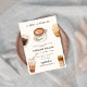 O convite de chá de bebê "O Bebê está Preparando Café" combina elegância e calor com um design temático de café. Com cores suaves e ilustrações de xícaras de café, define um tom aconchegante e convidativo. Ao redor do design, há vários tipos de café, como lattes e cappuccinos, que adicionam charme e alegria. É um convite elegante e moderno, perfeito para uma futura mamãe que ama café.