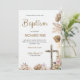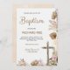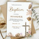 "Elegant baptism invitation featuring floral accents and a cross on a white background. Text includes details of the event and RSVP information."