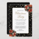 Elegant black and gold Christmas party invitation featuring gold confetti, flowers and Christmas ornaments. Easily personalize this invitation with your party details.