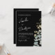 This elegant wedding invitation features a dramatic black background accented with delicate watercolor botanical florals and eucalyptus greenery for a refined, romantic look. The soft neutral blooms beautifully contrast against the dark backdrop, creating a sophisticated modern design. Stylish handwritten script highlights the couple’s names, while clean typography presents the wedding details with timeless elegance. Perfect for modern, formal, or evening weddings, this invitation combines botanical charm with contemporary styling to create a memorable first impression for your special day.