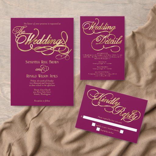 A formal, elegant burgundy wedding invitation with faux gold calligraphy script.