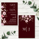 Announce your special day in style with this elegant burgundy floral save the date card. Featuring a deep wine background paired with soft blush flowers and delicate botanical details, this romantic design is perfect for formal and modern weddings alike.