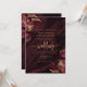 This elegant wedding invitation features burgundy red floral bouquets set off with gold faux foil greenery in two corners, on a background image of burgundy watercolor agate. The customizable text combines gold-colored serif, italic and handwriting fonts. The reverse side features a matching floral and agate design.