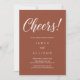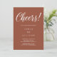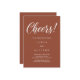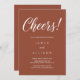 Invite your loved ones to celebrate your special day with this elegant Cheers Script Terracotta Wedding Invitation. Featuring a warm and inviting terracotta background, this design is beautifully accented with a graceful 'Cheers!' in classic white script. The earthy, rustic hue adds a touch of bohemian charm and warmth, making it perfect for fall weddings, outdoor ceremonies, desert-inspired themes, or any couple desiring a cozy and stylish celebration. Customizable with your names, wedding date, venue, and RSVP details, this invitation promises to set a unique and memorable tone for your joyful union.