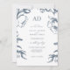 Vintage chic floral roses line art dusty blue flowers botanical garden elegant monogrammed wedding invitation with a trendy minimalist design. Suitable for spring summer fall or winter weddings.