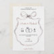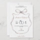 Elegant engagement party invitation with a bow design, featuring names, date, time, and venue details in a classic script. Simple and sophisticated.
