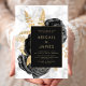 This elegant wedding invitation features a lush, romantic floral bouquet in black with gold faux foil and glitter foliage on a gray and white marble background. Customize the gold-colored text in stylish fonts on a black rectangle. The marble background is repeated on the back of the card.