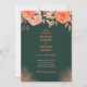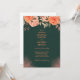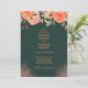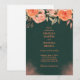 A sophisticated and romantic design featuring a deep green background adorned with delicate peach and coral floral arrangements. The rich contrast between the dark backdrop and soft botanical elements creates a refined and elegant atmosphere. The composition feels timeless and graceful, perfect for announcing a special occasion with a luxurious and nature-inspired aesthetic.