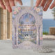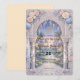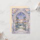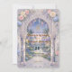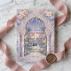 This refined wedding composition features a symmetrical garden arch framed with watercolor roses, hydrangeas, and cascading wisteria vines in soft lilac, blush pink, peach, dusty blue, and gentle greenery. A softly illuminated pathway and hanging lantern lights guide the eye toward the central arch beneath a deep twilight night sky, while Arabic Bismillah calligraphy appears above a structured typography layout combining decorative serif headings with flowing vintage script accents. Ornamental floral and geometric borders reflect classic Islamic and South Asian wedding stationery traditions commonly seen in Nikah ceremony designs.This is a flat printed image with a faux gold foil effect, not actual raised material.