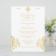 A gold and white damask wedding invitation featuring a classic, elegant design with intricate gold damask patterns on a white background, accented with gold for a luxurious, formal feel. These invitations are ideal for upscale or traditional weddings, setting a tone of grandeur and sophistication. This invitation is part of a set.