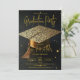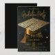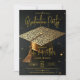 Celebrate the remarkable achievement of your graduate with this elegant gold and black graduation party invitation. Featuring a stunning 3D-style graduation mortarboard cap adorned with faux metallic gold and silver glitter against a sleek black background, this luxurious design sets the perfect tone for a glamorous celebration. Beautiful golden script typography highlights the graduate's name, making it an ideal choice for high school, college, or university graduation parties. Simply update the text templates with your details to invite friends and family in style!