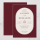 This elegant wedding invitation features a sophisticated oval frame centered on a deep maroon background, with a soft cream interior that highlights the text. The design uses classic serif fonts to convey formality and timelessness, arranged in a balanced layout that guides the eye smoothly from top to bottom. Customizable elements allow for personalization of names, dates, times, and locations, making it perfect for a formal celebration. The overall mood is one of traditional elegance, ideal for couples seeking a refined and harmonious aesthetic for their special day.
