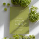 A minimalist wedding invitation featuring a refined olive green and white palette, paired with elegant serif typography and a soft script accent. The clean, structured layout creates a modern and understated look, perfect for couples who prefer a calm, editorial style.