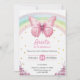 Front and back of a birthday invitation card featuring a pink butterfly, rainbow, and floral accents. Bright and whimsical design with celebration details.