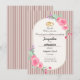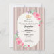 A beautiful and elegant wedding invitation featuring soft pink and purple floral designs with delicate gold wedding rings. The invitation is framed with a classic striped background and a graceful arch, creating a romantic and sophisticated look.