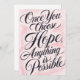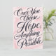 Send an uplifting message with this beautiful, hand-lettered quote design. Featuring the inspirational message, "Once You Choose Hope, Anything is Possible," written in elegant, flowing black script against a soft, dreamy pink watercolor background. This motivational quote product is perfect for encouragement cards, inspirational gifts, or positive affirmation decor. Ideal for women, teens, and anyone needing a boost of confidence or a reminder of possibility. The graceful calligraphy style adds a touch of sophistication, making it a wonderful thinking of you card or customizable stationery piece.