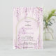 The design features delicate watercolor wisteria and lavender blooms cascading gracefully from the top, framing a sophisticated golden-beige arch. Set against a subtle blush-pink wash background, the typography combines classic serif fonts with a flowing, lavender-hued script for the couple’s names, creating a harmonious balance of modern structure and organic beauty.